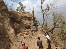 सडक खन्ने क्रममा माथिबाट ठुलो ढुंगा खस्दा स्काभेटरमा क्षती