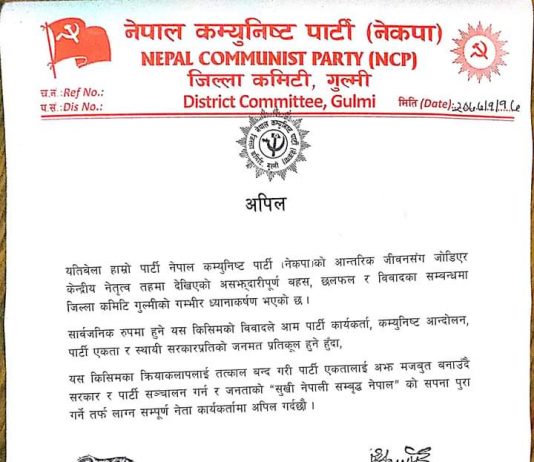 नेकपा गुल्मीको अपिल :पार्टी एकतालाई थप मजबुत बनाउँदै, सरकार र पार्टी संचालन गर्न जोड