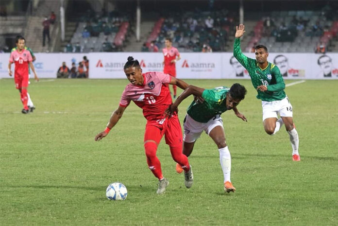 कात्तिक २८,२०७७ काठमाडौं : बंगलादेशसँगको पहिलो मैत्रीपूर्ण खेलमा नेपाल २(० गोल अन्तरले पराजित भएको छ। नेपालले पहिलो हाफको १० मिनेटमा पहिलो गोल खाएको थियो भने दोस्रो गोल दोस्रो हाफमा खेलको ८० औं मिनेटमा खाएको थियो।