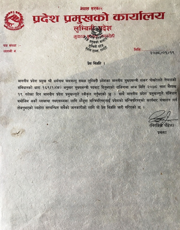 प्रदेशमा नयाँ सरकार बनाउने मार्ग प्रशस्त गर्न राजीनामा दिएका हुन्। पोखरेलले लुम्बिनी प्रदेश प्रमुख धर्मनाथप्रसाद यादव समक्ष आइतबार राजीनामा पेश गरेको प्रदेश प्रमुख कार्यालय स्रोतले बताएको छ। प्रदेश सरकार गठन हुँदाको अहिलेको कानूनी परिस्थिती फरक भएकोले नयाँ सरकार गठन गर्न मार्ग प्रशस्त गर्ने उद्देश्यले पोखरेलले राजीनामा दिएको बताइएको छ।
