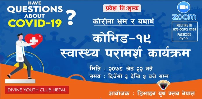 जेठ२२,२०७८ : डिभाइन युथ क्लव नेपालले कोभिड१९भ्रम र यथार्थ अनलाईन परामर्श कार्यत्रम आयोजना गर्ने भएको छ।