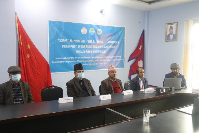पुस २३,२०७८ लुम्बिनी :लुम्बिनी बौद्ध विश्वविद्यालय र चीनको बेइजिङ ल्याङग्वेज एण्ड कल्चर विश्वविद्यालयबीच आपसी सहकार्य सम्झौता सम्पन्न भएको छ । मिति २०७८ पुस २३ गते भर्चुअल रुपमा आयोजित कार्यक्रमकाबीच दुई विश्वविद्यालयबीच सहकार्य सम्झौतामा हस्ताक्षर भएको हो ।
