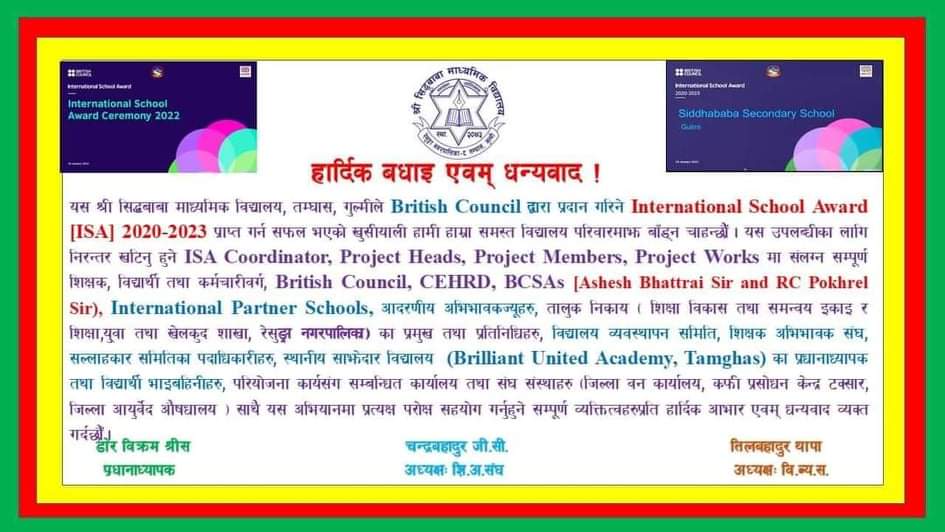 विद्यालयले ब्रिटिस काउन्सिलद्वारा प्रदान गरिने इन्टरनेशनल स्कुल अवार्ड 2020-2023 प्राप्त गर्न सफल भएको खुसीयालीमा उक्त अवार्ड प्राप्त गर्न खटिने संयाेजक, याेजनाका प्रमुख, सदस्यहरू र त्यसमा संलग्न सम्पूर्ण शिक्षक, विद्यार्थी तथा कर्मचारीहरु प्रति आभार प्रकट गरेको छ ।
