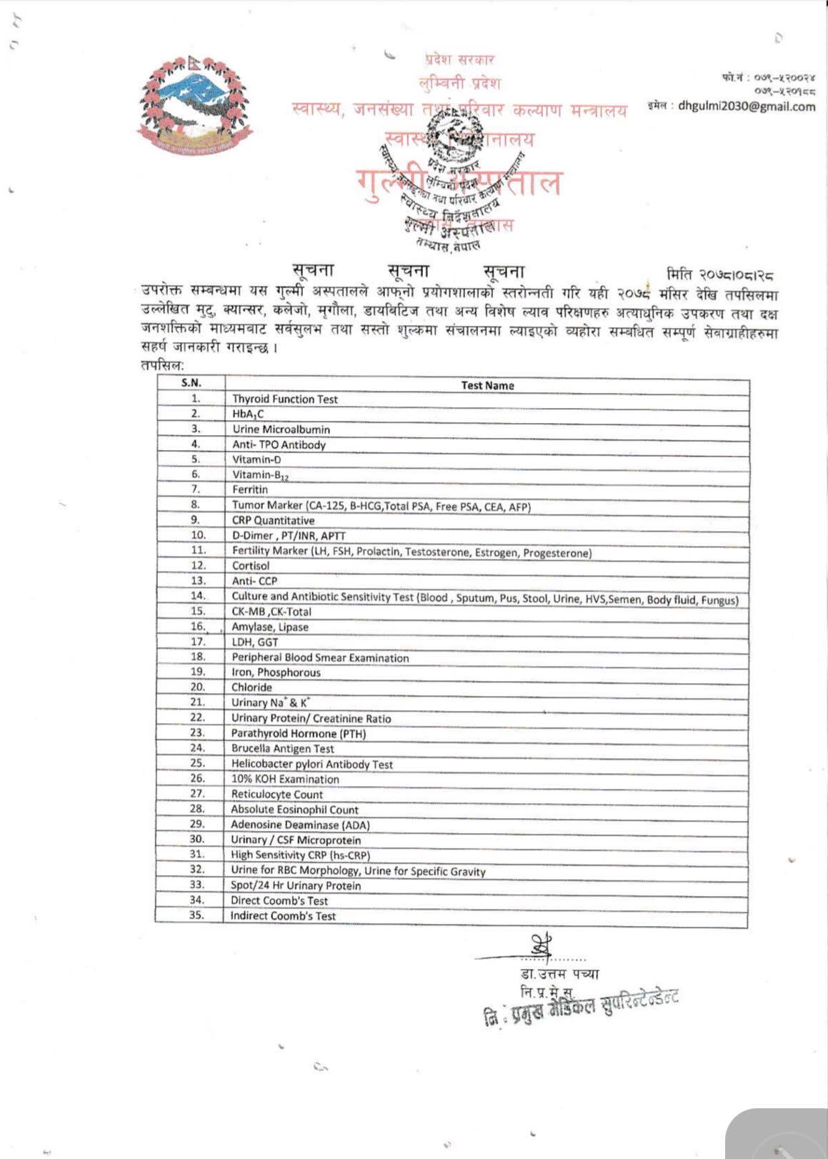 चैत ११,२०७८ गुल्मी :गुल्मी अस्पतालले प्रयोगशालाको सेवालाई सुदृढिकरण गर्दै विशिष्टिकृत परिक्षण सुविधाहरु संचालनमा ल्याएको छ ।