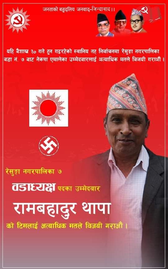 गुल्मी, २९ चैत ÷ गुल्मीको रेसुङ्गा नगरपालिका वडा नम्बर ७ मा रामबहादुर थापा सर्वसम्मत अध्यक्षको उमेदवार बनेका छन् । नेकपा एमाले वडा कमिटीको तर्फबाट थापा सर्वसम्मत वडाध्यक्षको उमेदवार बनेका हुन् ।
