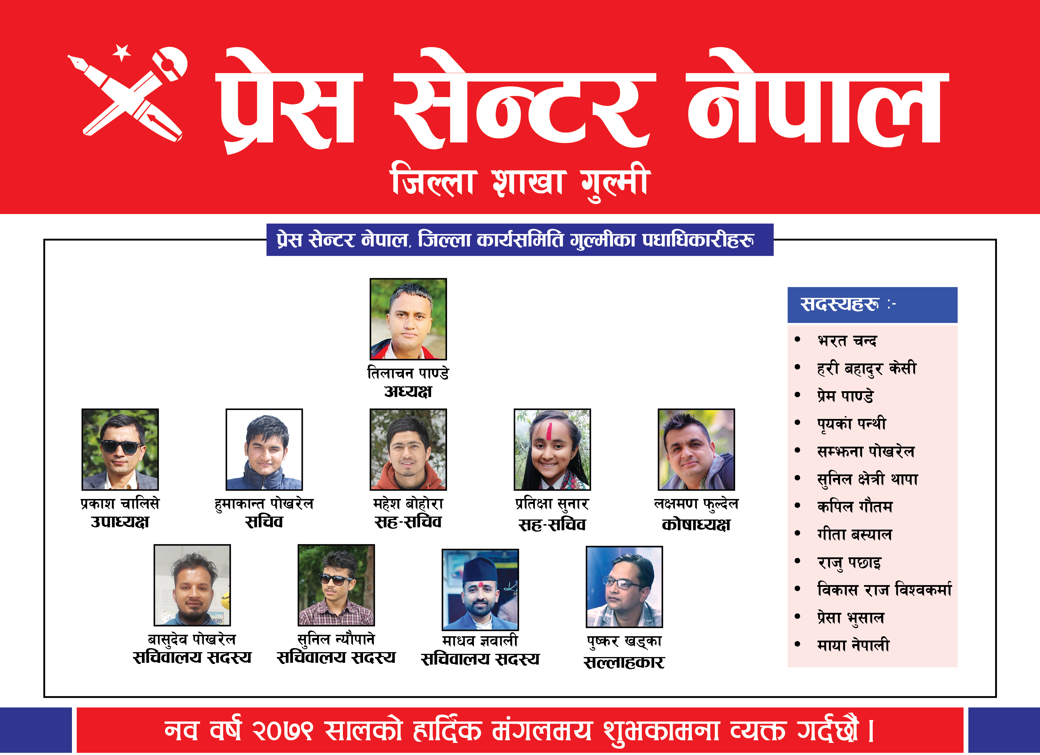 बैशाख ७,२०७९ गुल्मीः प्रेस सेन्टर नेपाल, जिल्ला शाखा गुल्मीको २०७९ सालको भित्तेपात्रो विमोचन गरिएको छ ।
