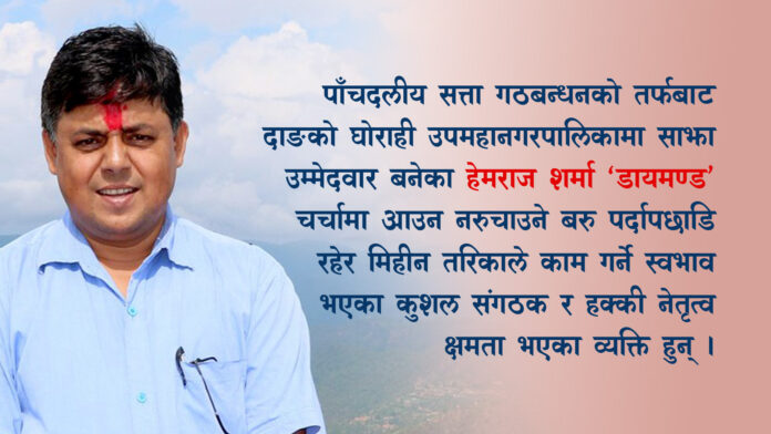 पार्टीभित्र वा बाहिर डायमण्ड उपनामले चिनिने हेमराज शर्मा अहिले गठबन्धनका तर्फबाट घोराही उपमहानगरपालिका प्रमुखका उम्मेदवार रहेकाछन् ।माओवादी शान्ति प्रक्रियामा आइसकेपछिका १५ वर्षसम्म राजकीय पदमा नरहेका डायमण्डले पार्टी जिम्मेवारीमा रहेर दाङका थुप्रै नेता, कार्यकर्ताहरुलाई राजकीय जिम्मेवारीमा पु¥याउन कुशल संगठकको भूमिका खेलेका छन् ।