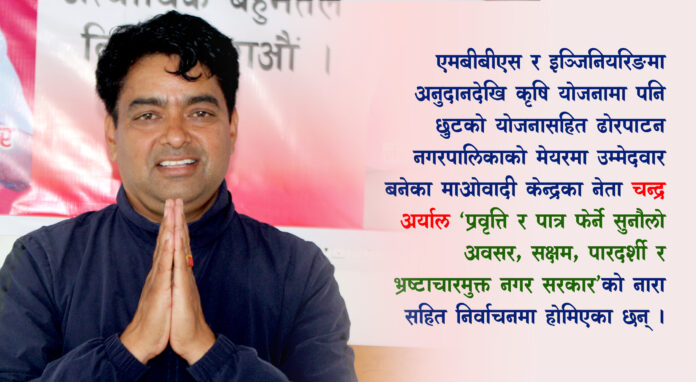 ‘प्रवृत्ति र पात्र फेर्ने सुनौलो अवसर, सक्षम पारदर्शी र भ्रष्टाचारमुक्त नगर सरकार’ भन्ने मूल नारा लिएर उहाँ चुनावी प्रचार प्रसारमा होमिनुभएको छ । मेयरका प्रत्यासी अर्यालले आफूसँग स्पष्ट भिजन भएको दाबी गर्दै ढोरपाटनवासीले आफूलाई नै विजयी गराउने विश्वास व्यक्त गर्नुभयो ।