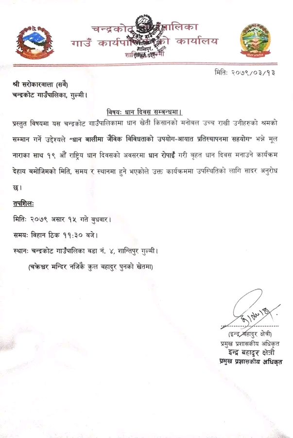 गाउँपालिकाले गाउँपालिकाकाे शान्तिपुरमा रहेको कुलबहादुर पुनको खेतमा वृहत् धान रोपाइँ गर्ने भन्दै उपस्थितिका लागि चन्द्रकाेटवासीलाई आग्रह गरेको छ ।
