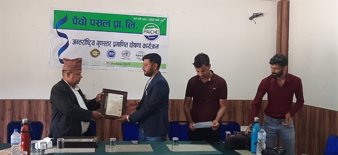 गुणस्तर व्यवस्थापन प्रक्रिया, खाद्यसुरक्षा व्यवस्थापन, स्वास्थ्यको सन्दर्भमा विश्व स्वास्थ्य संगठन र जोखिम बिश्लेषण र नियन्त्रण सम्वन्धिको लेखापरीक्षण, अनुगमन, नियमन र निगरानीबाट ४ अन्तराष्ट्रिय गुणस्तर चिन्ह प्राप्त भएको पैंचो पसल प्रालिका संचालक धुर्ब न्यौपानेले जानकारी दिनुभयो ।
