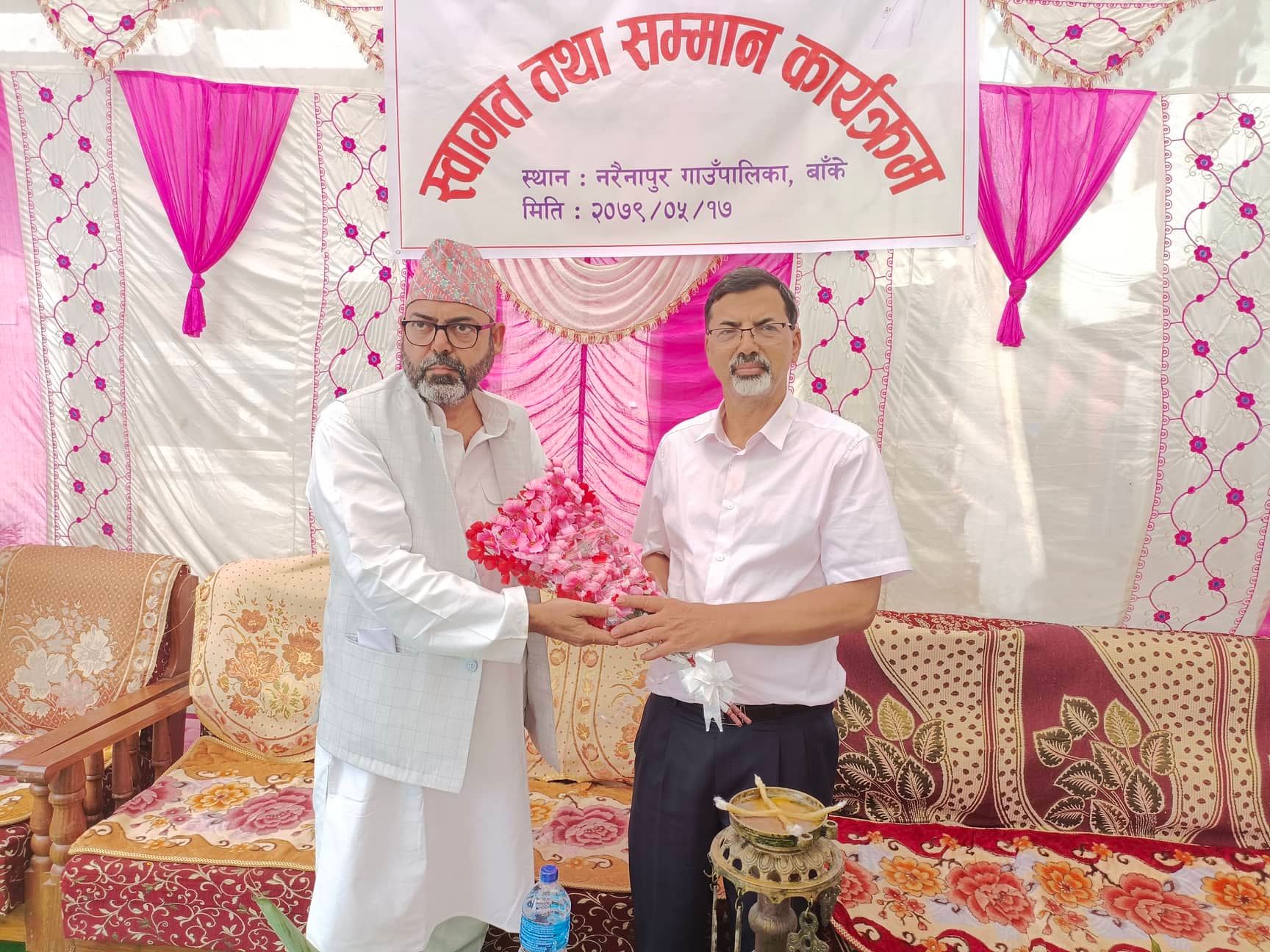 अनुगमनमा पुग्नु भएका मन्त्री शर्मालाई नरैनापुर गाँउपालिका अध्यक्ष शाहले खादा र टोपी लगाएर स्वागत गर्नु भएको थियो भने प्रमुख प्रशासकिय अधिकृत भरत बस्नेतले गाँउपालिकाको डाइरी हस्तान्त्रण गर्नु भएको थियो । कार्यक्रमको संचालन जिन्सी शाखा प्रमुख भरत महतोले गर्नु भएको थियो ।