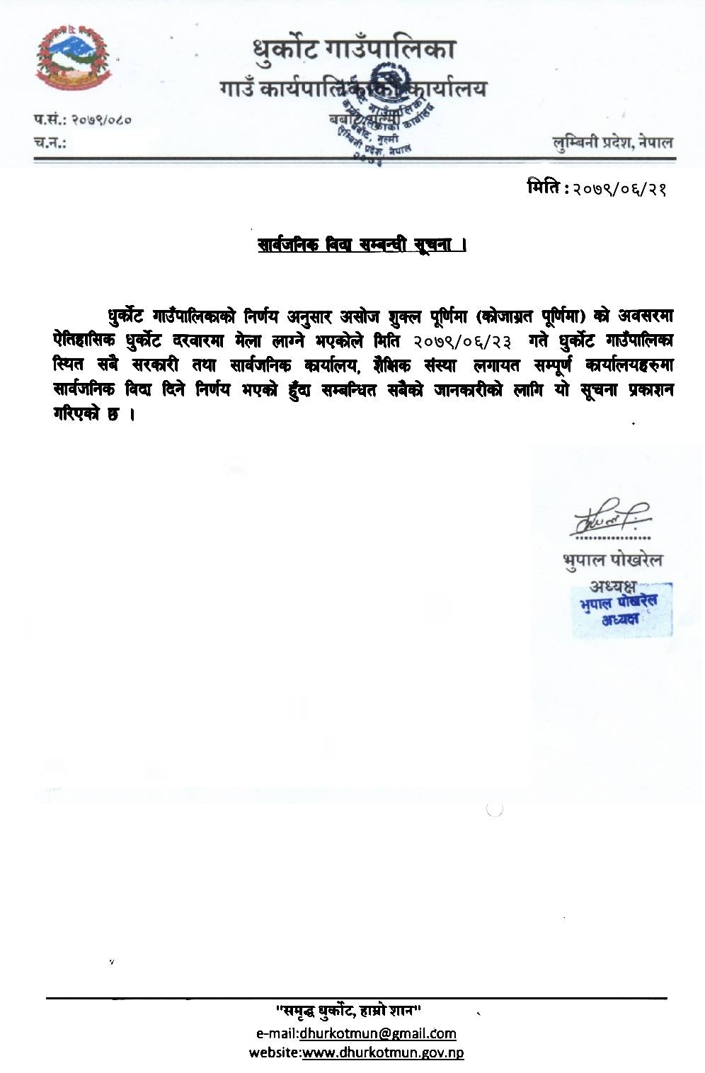 गाउँपालिकाले शनिबार एक सूचना जारी गर्दै पूर्णिमाको दिन धुर्कोट कोटमा सरायँ नाँच हुने भएकोले पालिकाभरी सार्वजनिक बिदा दिइएको गाउँपालिका अध्यक्ष भूपाल पोखरेलले जानकारी दिए ।