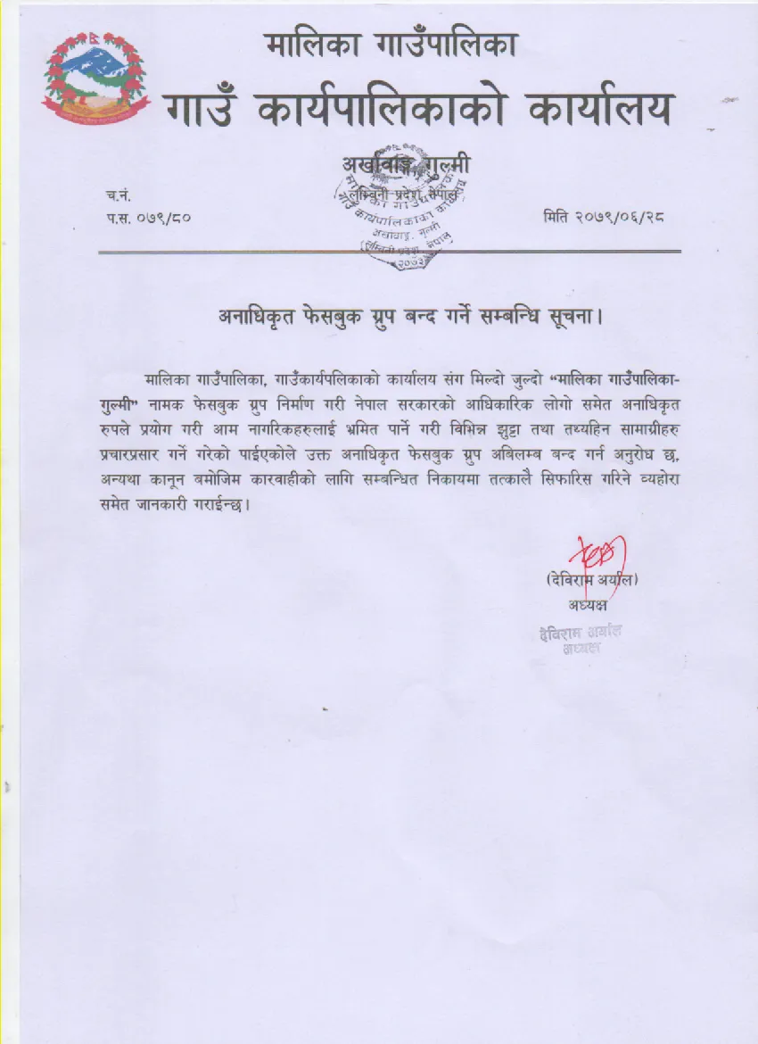 शुक्रबार गाउँपालिकाले एक सूचना जारी गर्दै मालिका गाउँकार्यपालिकाको कार्यालय सङ मिल्दोजुल्दो (मालिका गाउँपालिका गुल्मी) नामक फेसबुक गुर्प सञ्चालन गरि सरकारी लोगो अनाधिकृत रुपले प्रयोग गरेको भन्दै गाउँपालिकाले त्यस्ता गुर्प बन्द गर्न आग्रह गरेको हो ।