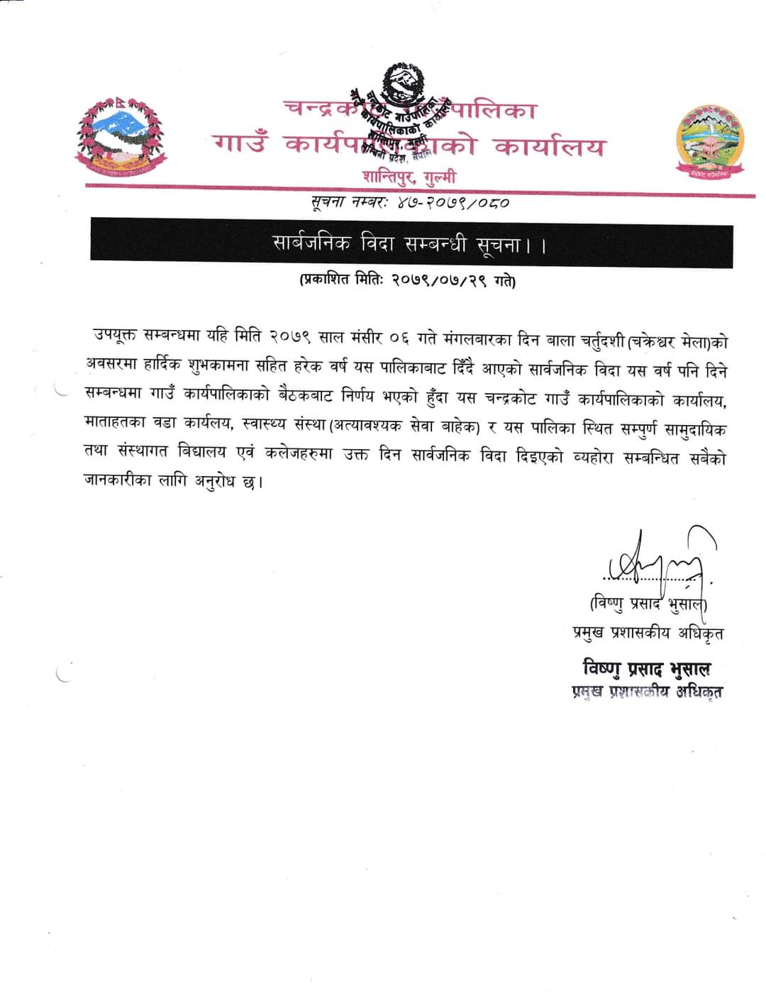 चन्द्रकोट गाउँपालिकाले मंसिर ६ गते बाला चतुर्दशीमा सार्वजनिक बिदा दिने निर्णय गरेको छ ।