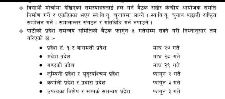माओवादी केन्द्रको हालै सम्पन्न स्थायी समिति बैठकले विद्यार्थी संगठनमा देखा परेका समस्याको समाधानको गर्ने, सबैलाई एकठाउँमा ल्याएर आयोजक समिति बनाउने र स्वावियु चुनावपछि राष्ट्रिय सम्मेलनको आयोजना गर्ने निर्णय गरेको थियो ।