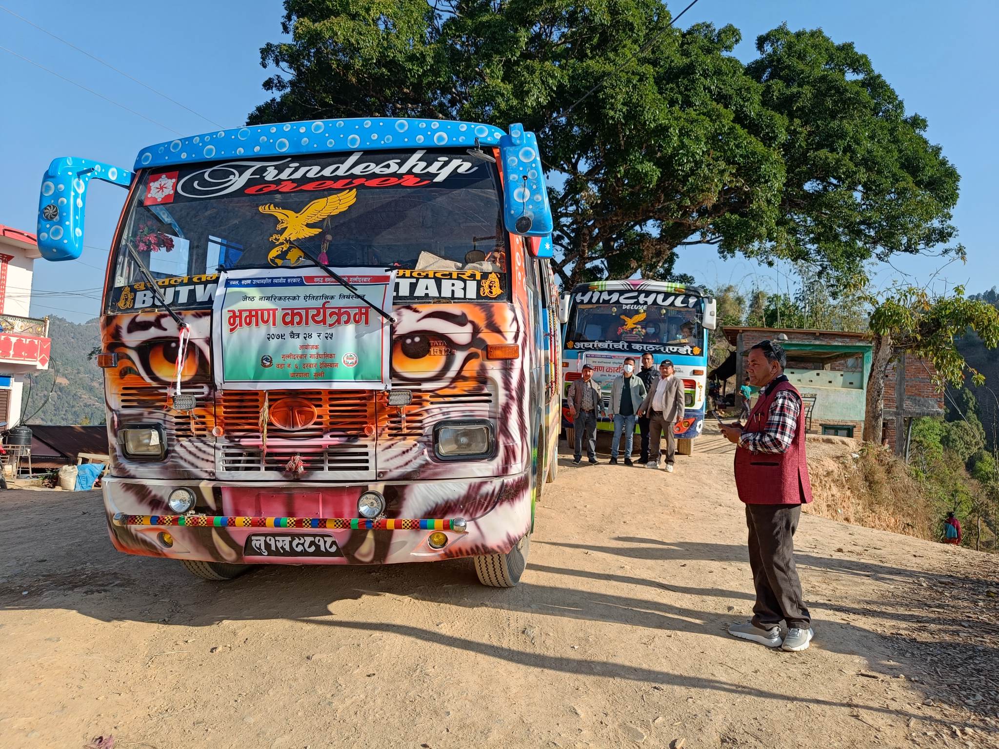जेष्ठ नागरिक भ्रमण कार्यक्रममा जेष्ठनागरिकहरुको यात्रा ब्यवस्थापन गर्न वडा सदस्य रेशम प्रधान , विष्णु सुनार