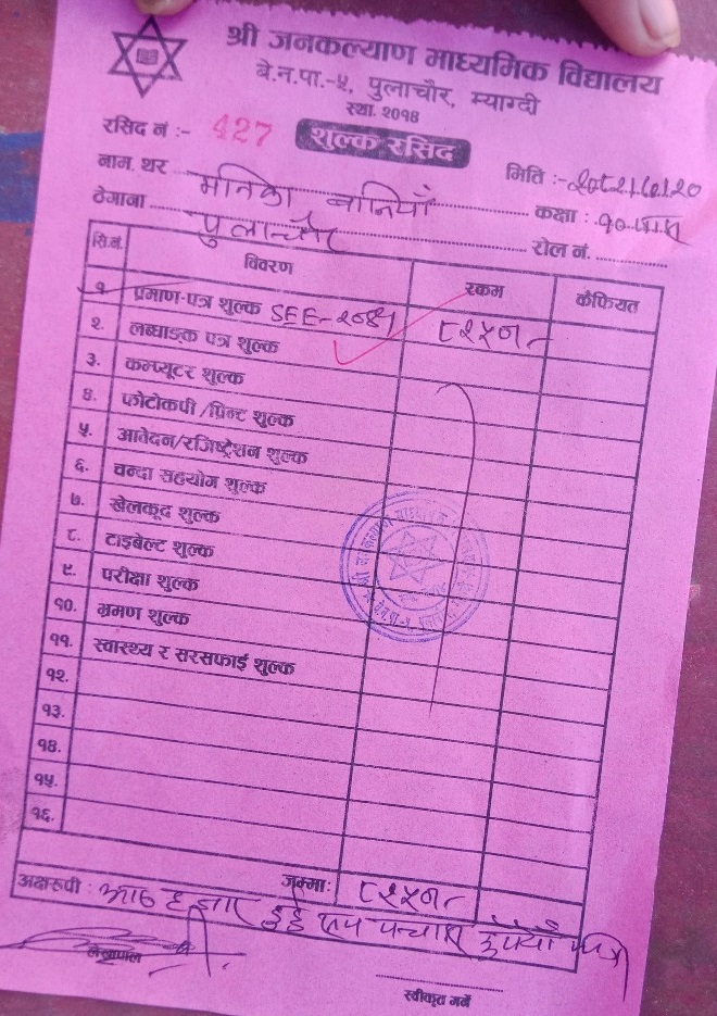 विद्यालयले एसइई उत्तीर्ण भएको सर्टिफिकेट दिँदा विद्यार्थीबाट आठ हजार दुई सय पचास रुपियाँ शुल्क लिएको हो । विद्यालयले यही कात्तिक २० गते मनिका बानियाँबाट चार सय २७ नम्बरको रसिदबाट एसइई प्रमाणपत्र शुल्कबापत उक्त रकम लिएको खुलासा भएको छ । विद्यार्थीबाट चर्को शुल्क लिने उक्त विद्यालयप्रति अभिभावकले सार्वजनिक रुपमा आवाज उठाउन थालेका छन् ।