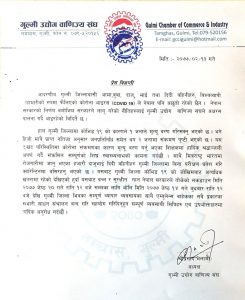 सोमबार गाउँपालिकाका अध्यक्षलाई नै कोरोना संक्रमण भएपछि गुल्मी उधोग बाणिज्य संघका अध्यक्ष श्रीप्रसाद भलामीले एक बिज्ञप्ती जारी गर्दै १४ गते राती १२ बजेदेखि २० गते सम्मका लागि सबै ब्यबसायहरु बन्द गर्नका लागि आग्रह गरेको छ ।